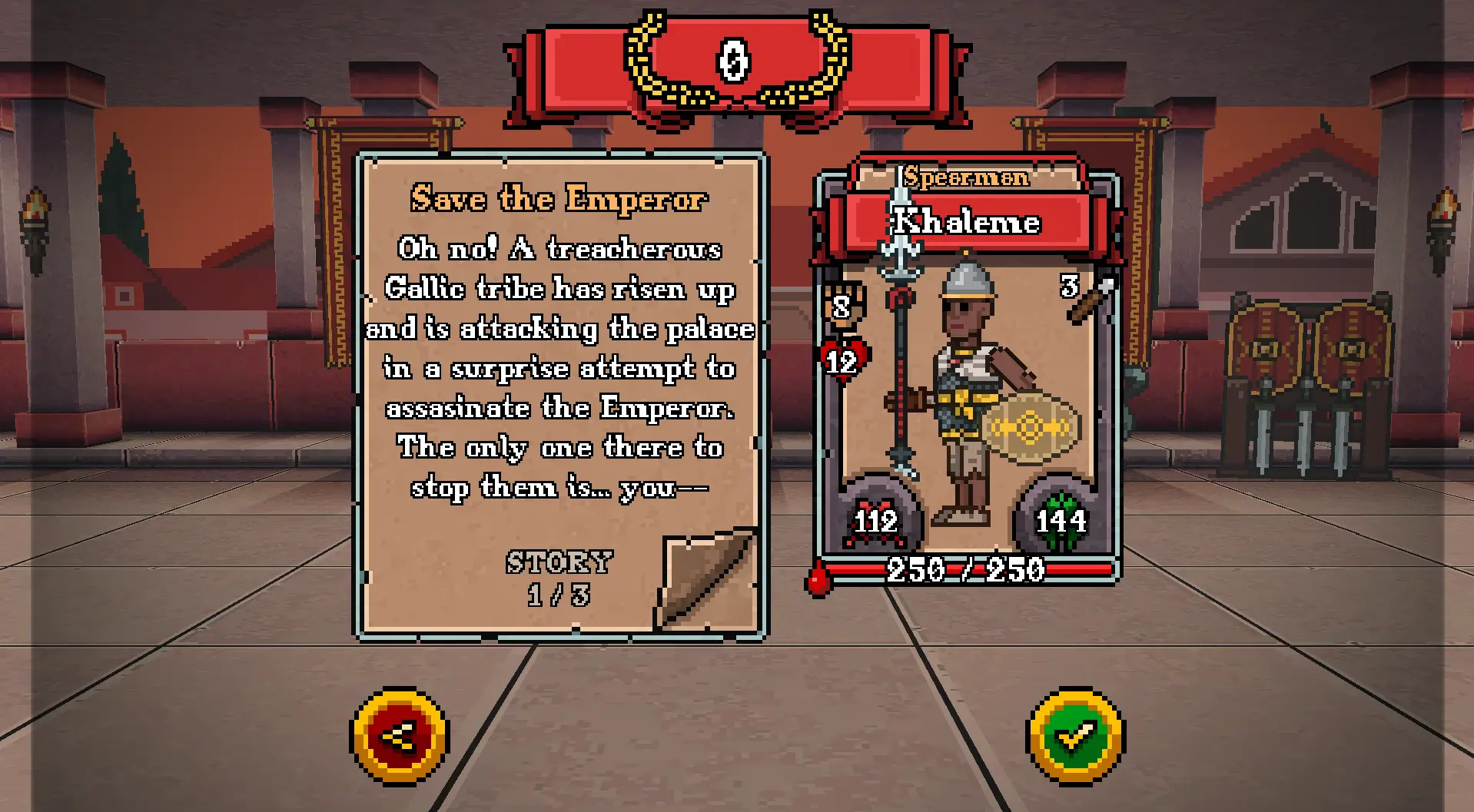 | Crassus | Swordsman | Golden Gladius | 16 | Weapon | “This sword should be most fitting for a man like you.” |